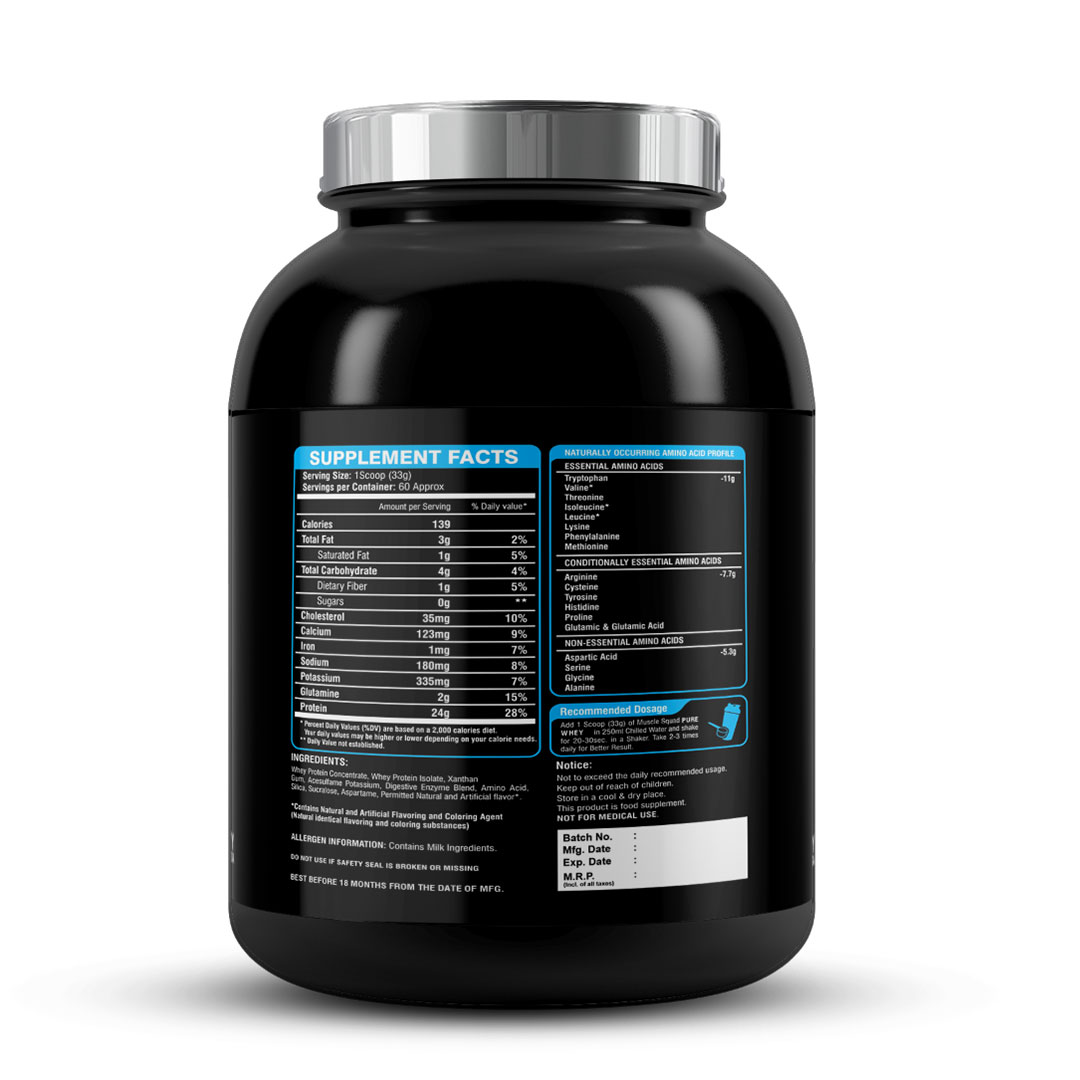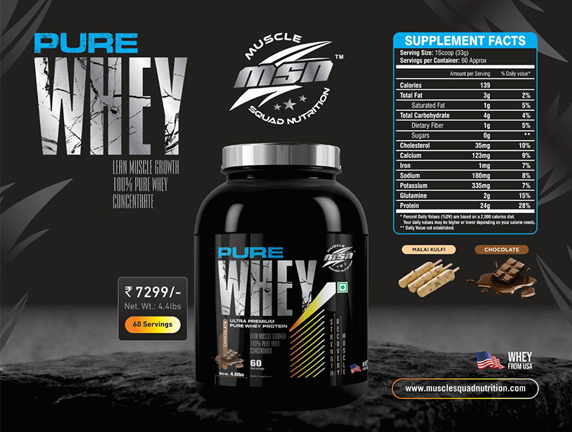 Pure Whey kick starts your workout journey. Each serving offers 24 grams of premium protein's blend with simple carbs and digestive enzymes. It doesn’t contain any added sugar or trans-fat. This beginner's formula is specially designed for lean muscle gain, muscle recovery and to maintain strength and energy level.